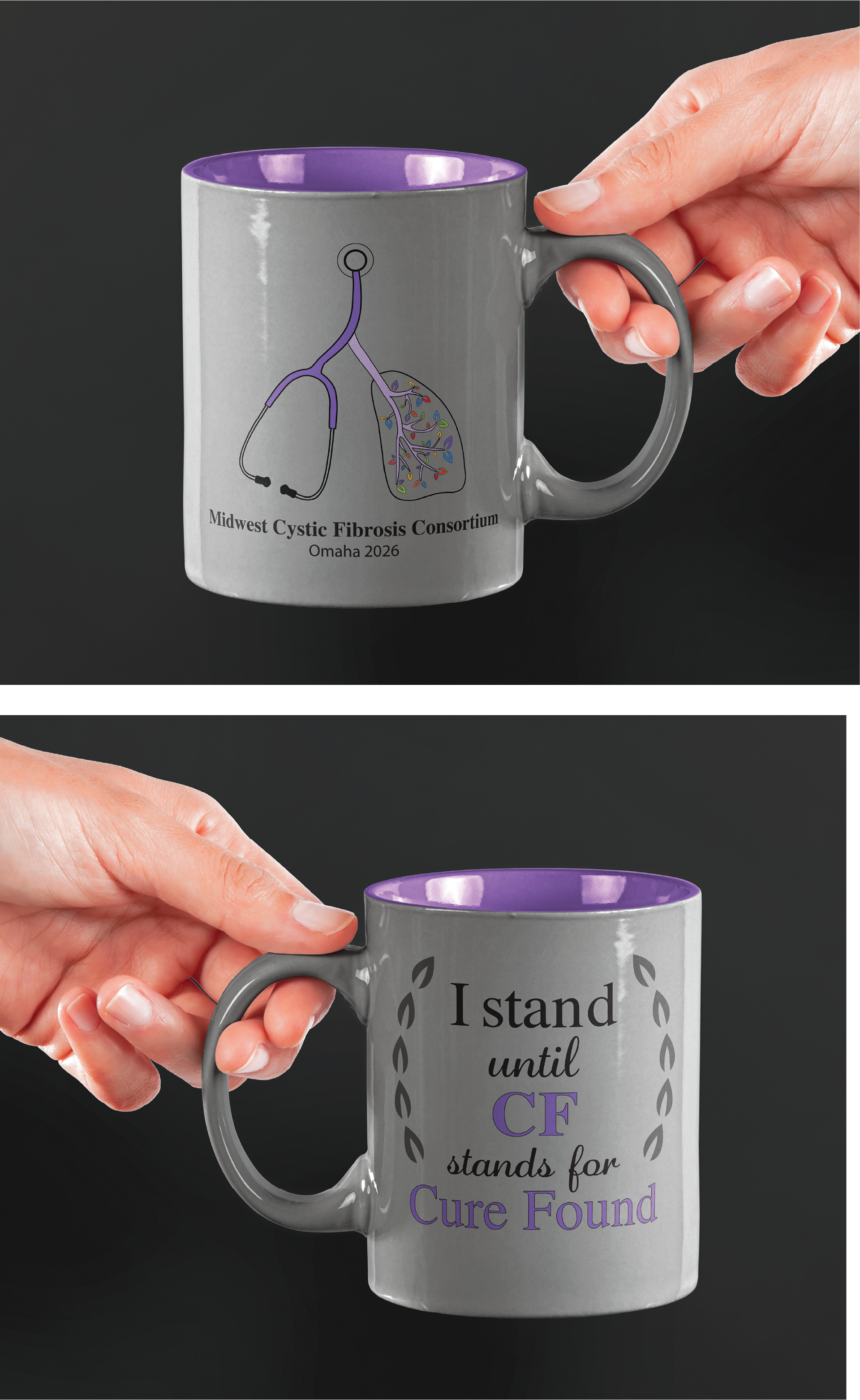 Finally, I designed these mugs that one can get at the conference as a souvenir. The color scheme is purple and gray to match the color palette of the consortium. On one side the consortium name and logo are showcased, and on the other side the phrase "I stand until CF stands for Cure Found" is printed. This is a common phrase in the Cystic Fibrosis community and is appropriate for this conference as the point of the consortium is to come together and discuss new ways to help cure Cystic Fibrosis.